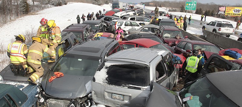 Рис. 6. "А я на всесезонке!" По утверждению журнала "За рулем" от 2004 года 75% канадцев убеждены, что всесезонная резина полностью обеспечивает безопасность, а зимняя придумана для кого-то другого. И вот к чему это иногда приводит. В этот раз повезло, и при столкновении 96 машин и все отделались легкими ушибами, потому что ехали медленно и пристегнутыми, осознавая, что под колесами гололёд.